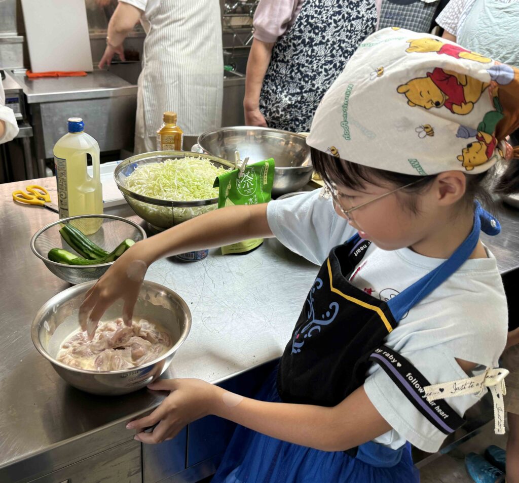 今回も、じゃがいもやにんじんの皮をむいて包丁で切ったり、たまねぎを切ったり、からあげ粉にとり肉を入れてもみこんだり、梨の皮をむいたりなど、自分たちでできる作業をそれぞれ頑張っていました。
